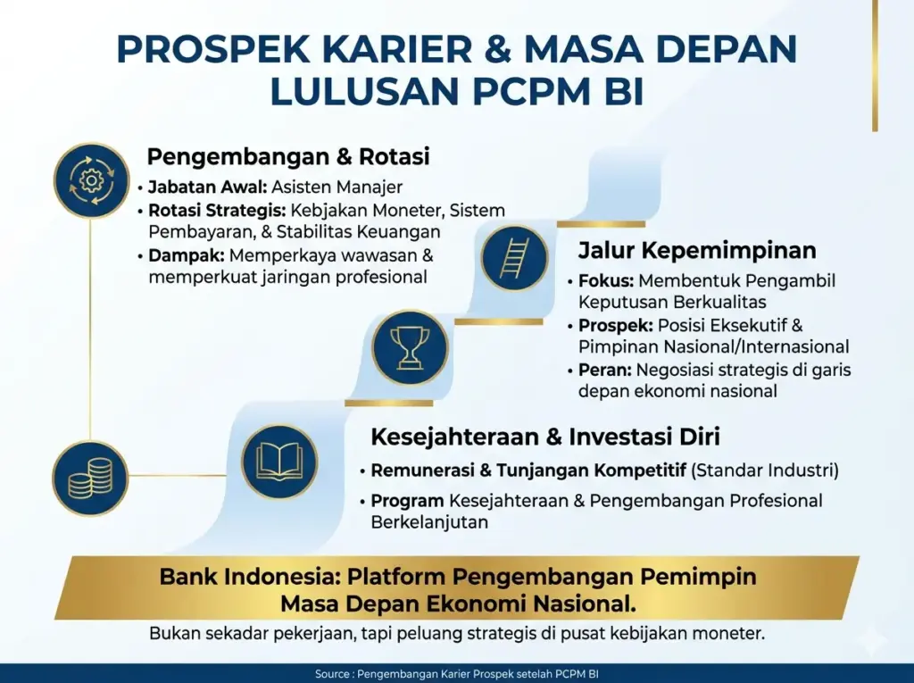 Program PCPM di Bank Indonesia menyediakan jalur karier yang unik, setara dengan manajemen trainee di korporasi besar. Program ini memungkinkan peserta untuk mempercepat jenjang karier dengan melewati posisi entry-level konvensional. Setelah kurang lebih satu tahun pelatihan intensif, peserta langsung ditempatkan di posisi Asisten Manajer, tanggung jawab yang biasanya dicapai setelah lima tahun atau lebih berjalan pengalaman.