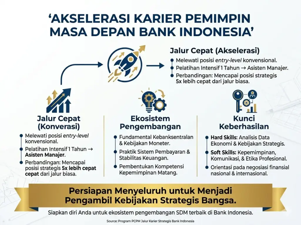 Bank Indonesia sebagai otoritas moneter di Indonesia menawarkan peluang karier yang prestisius dan kompetitif, khususnya melalui program PCPM (Pendidikan Calon Pegawai Asisten Manajer). Memahami jalur karier di Bank Indonesia bisa menjadi keunggulan strategis bagi para peserta seleksi dan calon pengelola kebanksentralan yang ambisius. Pada tahun 2026, proses seleksi dan pelaksanaan PCPM semakin menegaskan eksistensi Bank Indonesia dalam membangun sumber daya manusia berkualitas melalui program pengembangan karier yang matang dan terstruktur.