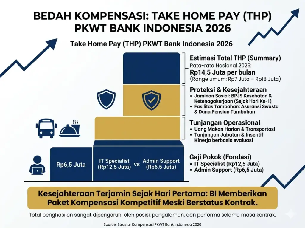 Paket kompensasi bagi pegawai PKWT di Bank Indonesia terdiri dari beberapa elemen utama yang membentuk total take home pay (THP) yang bersaing di pasar kerja. Rata-rata THP berkisar antara Rp7 juta hingga Rp18 juta per bulan, tergantung posisi, latar belakang pendidikan, dan pengalaman kerja masing-masing.