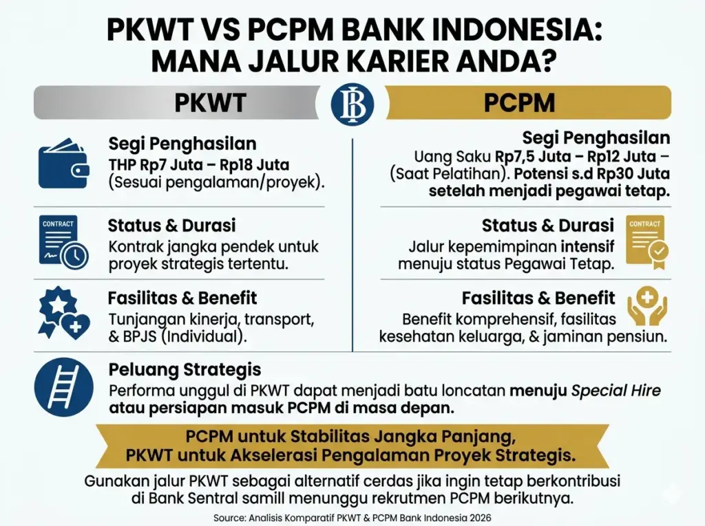Memahami perbedaan antara jalur PKWT dan PCPM penting untuk merancang karier jangka panjang di Bank Indonesia. Keduanya punya karakteristik, kompensasi, dan implikasi yang berbeda terhadap stabilitas dan pengembangan karier pegawai BI.