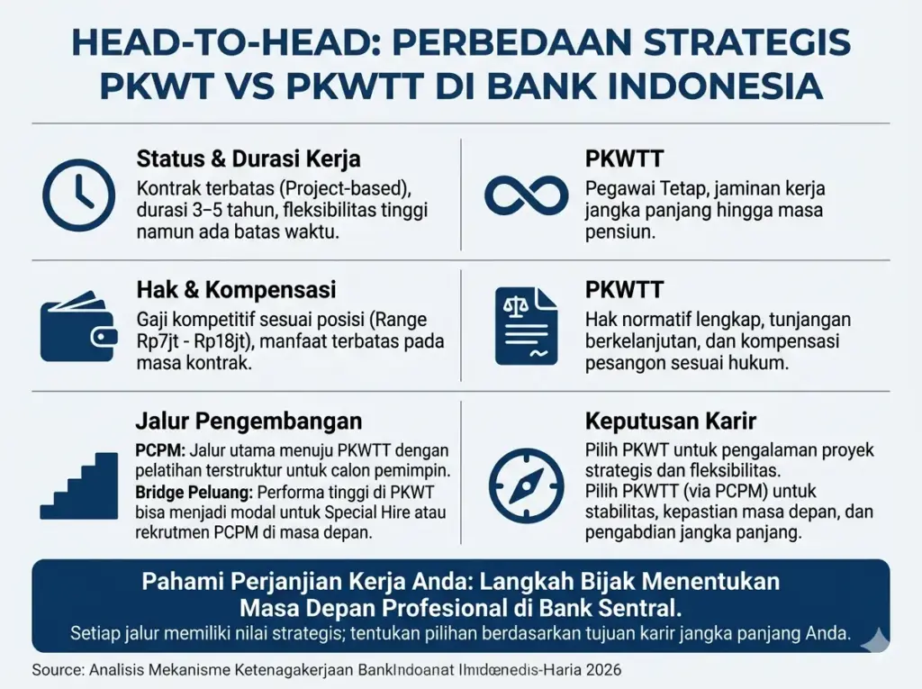 Dalam dinamika karier di lingkungan Bank Indonesia, penting bagi peserta dan pelamar Program Calon Pegawai dan Pegawai Magang (PCPM) untuk memahami status kepegawaian dengan baik. Perbedaan antara Perjanjian Kerja Waktu Tertentu (PKWT) dan Perjanjian Kerja Waktu Tidak Tertentu (PKWTT) menjadi faktor penting yang memengaruhi jalur karier dan peluang pekerjaan tetap di institusi ini.